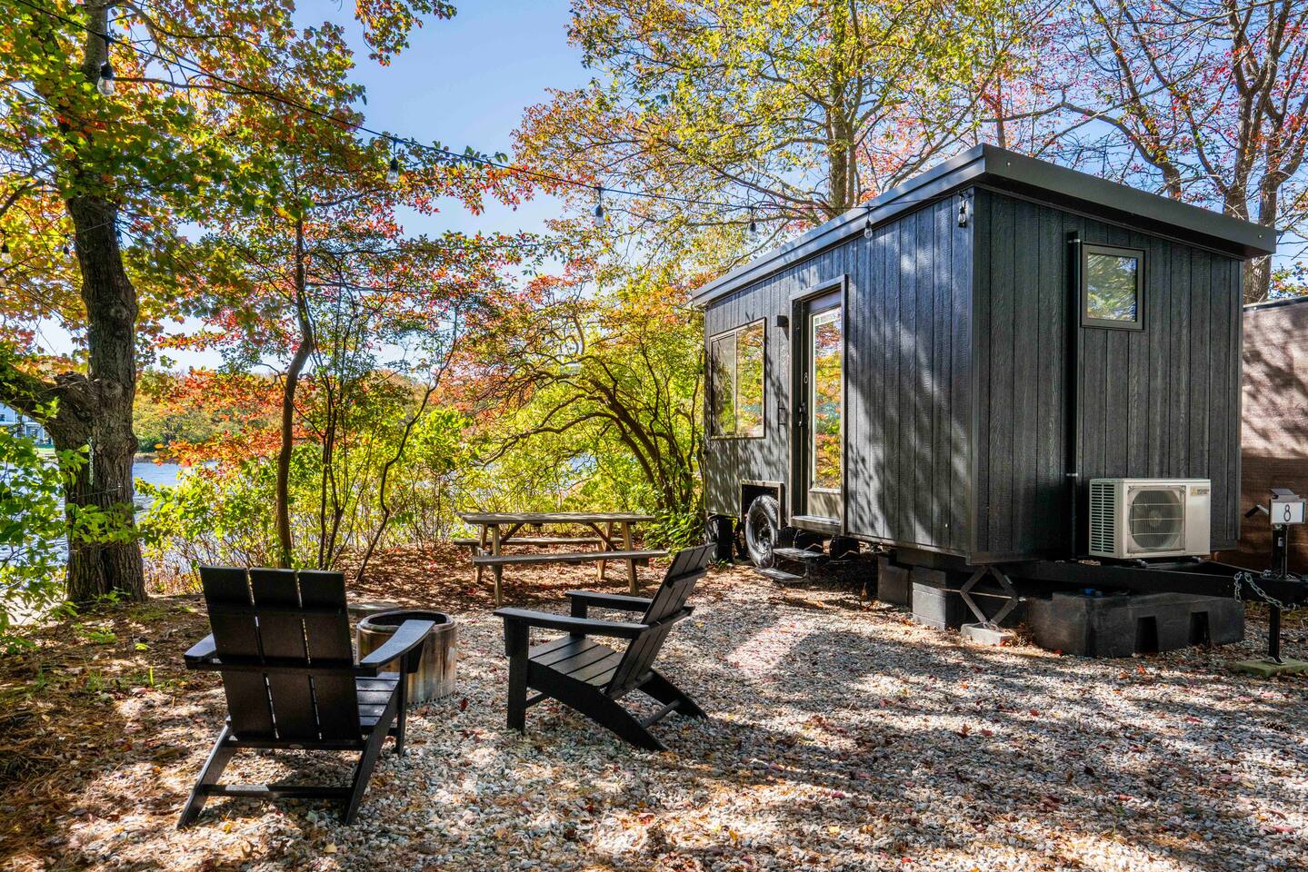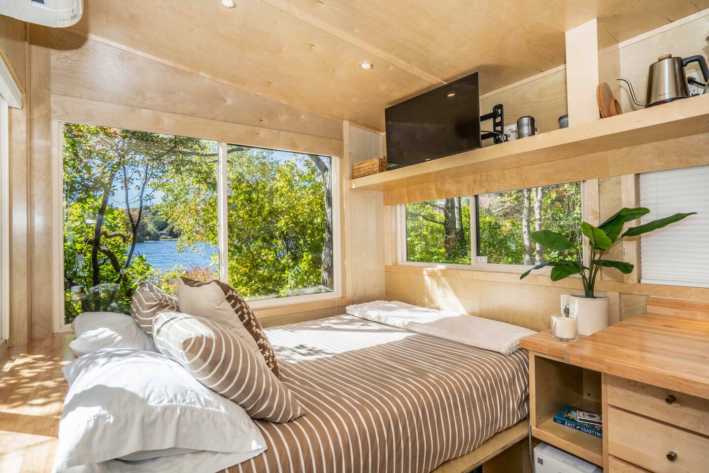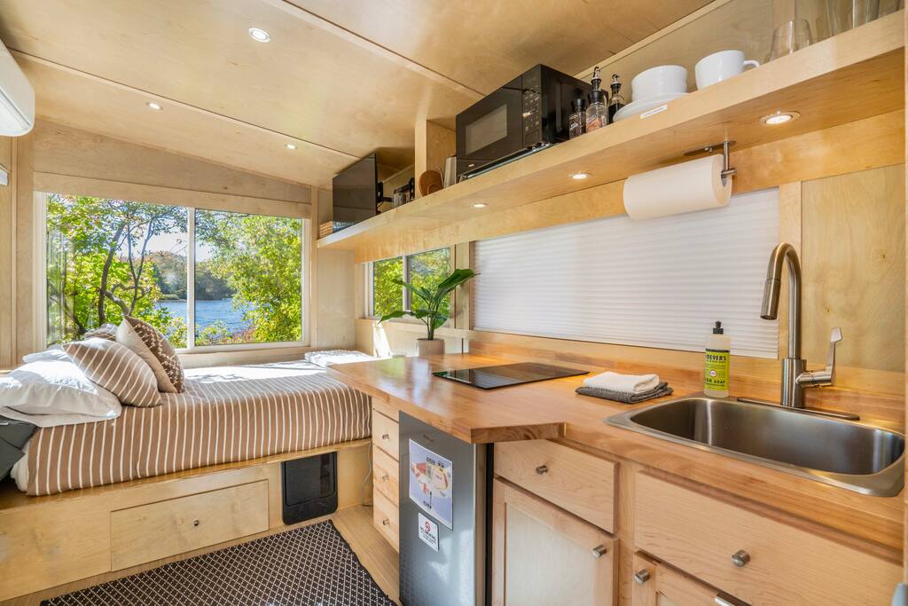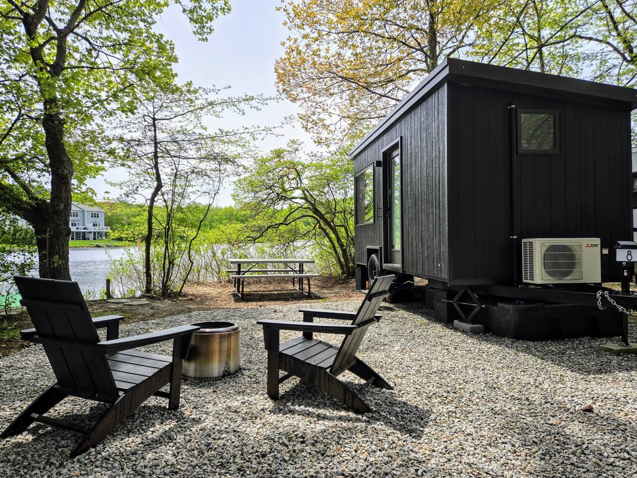 Perched at the tip of our private island on Pattagansett Lake, the Panoramic Point Tiny House is our coziest yet most charming retreat. Enjoy stunning lake views through oversized windows and all the comforts you need: a queen bed, fully equipped kitchenette, full bathroom, and efficient climate control. Get out on the water with free kayaks available in our nearby boat launching area. Perfect for a romantic, relaxing, or budget-friendly stay, this tiny house offers big charm in a small space.